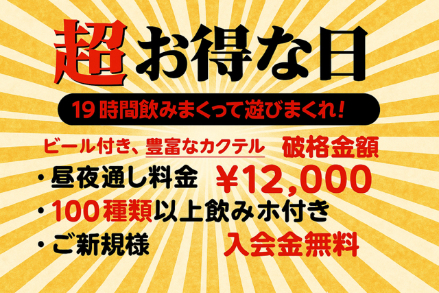 「超」お得な日♪ 掲示板に書き込みをすると 『延長料金なし!!』 『新規入会金無料!!』 100種類以上のカクテルとビールも『飲み放題!』が無料で付いてくるよ🍺 ゆったり...